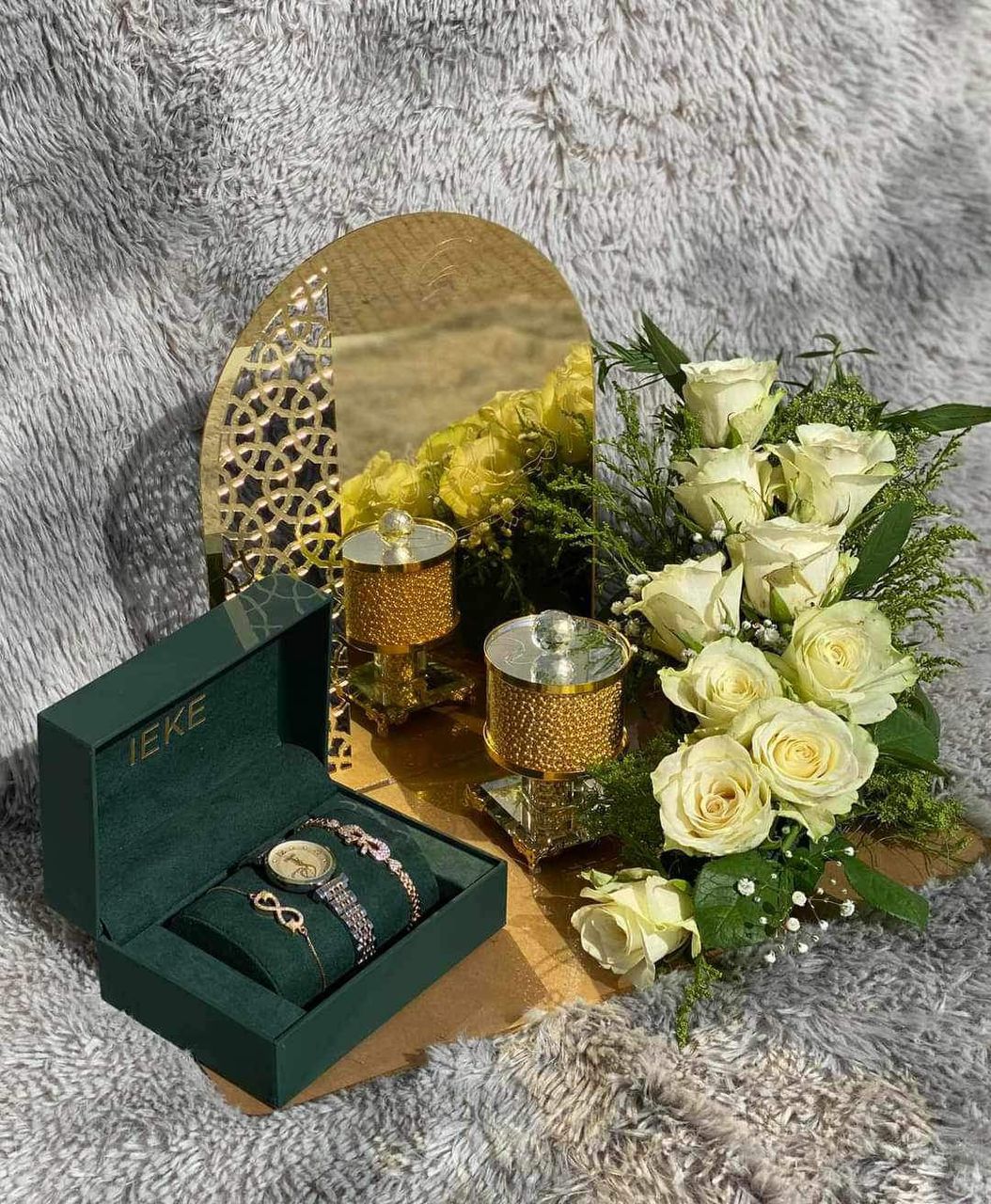 ساعة، نظارة، عطر ، مجوهرات، ذهب، مبالغ مالية، جميع انواع الشوكلاطة والحلو والمكسرات والعصائر والمشروبات الغازية ومتوفر لدينا جميع انواع التغليف وبوكسات الهدايا تبدء اسعار التغليف من 30 د.ل إلى حسب رغبة الزبون والمواد